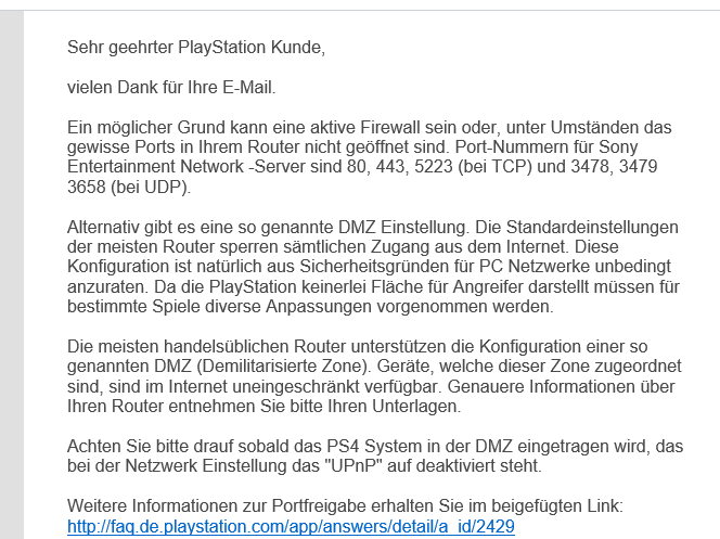 Danke für den Post der E-Mail. Die Ports hatte ich zwar schon freigegeben, aber dadurch bin ich auf die Idee mit der DMZ bzw. die PS4 als "Exposed Host" in den Router einzutragen. Außerdem habe ich noch den Teredo-Filter deaktiviert, was man ja eigentlich bei der XboxOne machen soll, scheint aber auch bei der PS4 nicht zu schaden. Auf jeden Fall kann ich mich zumindest im Moment durch eine der beiden Maßnahmen oder sogar durch beide beim PSN anmelden. Ich hoffe das bleibt so. Das war jetzt aber auch wirklich ein gefrickel. Ich habe ja schon viele Geräte hier im WLAN eingerichtet, von Smartphone über BluRay-Player mit SmartTV-Funktionen bis hin zu diversen Konsolen, aber so ein Rumgemache wie mit der PS4 hatte ich bisher auch noch nicht. Verglichen mit meinen anderen WLAN-fähigen Geräten scheint das WLAN-Modul der PS4 zudem nicht besonders leistungsfähig zu sein, aber ich hoffe es reicht für meine Bedürfnisse. :)
