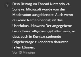 es geht um einen post den ich letztens macht habe der ausgeblendet wurde. ich find es ja gut und richtig dass userfokus moderiert wird, ich versteh nur nicht wo die moderation da ihre grenze setzt. in dem beispiel hab ich geschrieben dass einige xboxler mittlerweile auch eine ps5 zu hause stehen haben (und extra gesagt ich nenne keine namen um es so generell wie möglich zu halten). das ist ja weder ne beleidigung, noch ist damit explizit jemand rausgepickt und dazu ist es auch noch schlicht die wahrheit (und aus dem stehgreif fallen mir da mindestens 3 user ein bei denen das zutrifft).